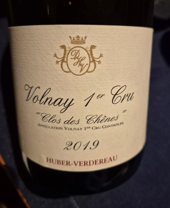 Volnay 1er Cru Clos des Chenes Huber Verdereau 2019 – Varietal 100% Pinot Noir com 13,3% de álcool e passagem por barricas Alier francesas, sendo 30% novas – Rubi com reflexos violáceos, alta concentração de cor, sem halo. Nariz com frutas vermelhas frescas, couro, especiarias, toque floral e baunilha. Na boca alta acidez, taninos finos ainda presentes, corpo médio, existência longa e retrogosto frutado. Mais um vinho jovem pedindo tempo em garrafa – Confrade Ricardo 110Euros na Europa Minha nota 92 pts