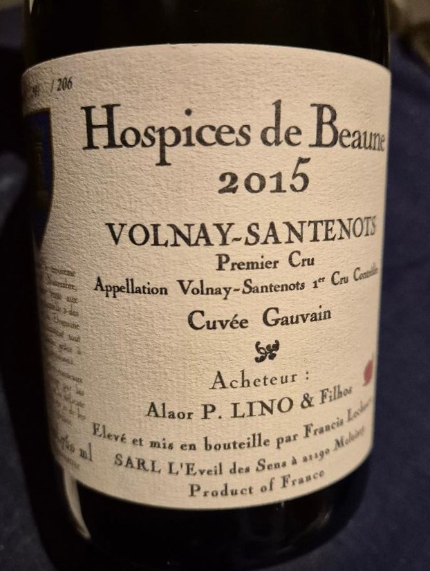 Volnay 1er Cru Hospices de Beaune cuvee Blondeau 2015 vários vinhedos entre eles Champans, e Taille Pieds – Varietal 100% Pinot Noir com 14,1% de álcool e passagem por barricas de carvalho francês – Violáceo, extra tinto, sem halo. Nariz com morango, couro, casca de laranja, toque floral e baunilha. Na boca acidez cortante, taninos ainda rascantes, corpo médio para longo, ponta de álcool, boa persistência, final de boca bem frutado com toques de terciários. Um vinho ainda jovem, mas potável e gastronômico. – Confrade Humberto R$ 1.460,0 na Anima Vinum nota 92 1/2pts