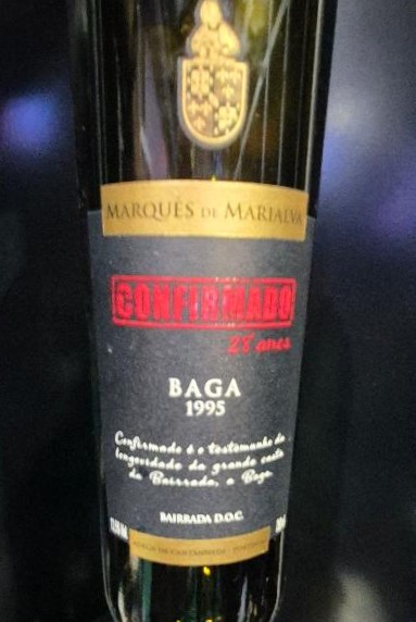 Marques de Marialva Confirmado 1995 Varietal 10% Baga da região da Bairrada – Produtor Cooperativa de Cantanhede – Granada, extra tinto, halo intenso. Olfativamente complexo, maduro, frutas negras com ligeira evolução, floral lembrando rosas, toque terroso e lácteo, couro, cacau leve mentolado e tosado. Na boca deliciosamente harmonioso com acidez, taninos e álcool combinando, estruturado, longo sem ser pesado. Um senhor Vinho que me fez lembrar um bom Barolo.